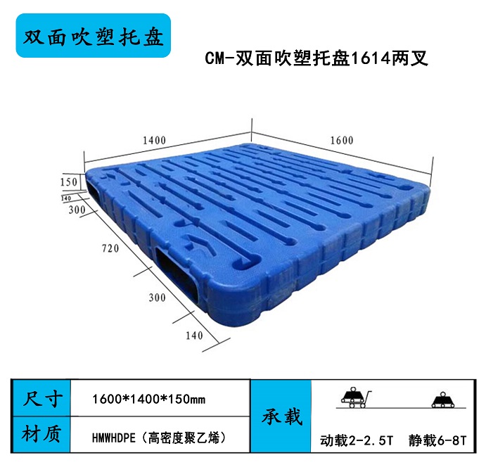 產品描述:1614雙面吹塑托盤,中空塑料托盤1.6*1.4米,重型叉車托盤1614,1.,6*1.4米塑料托盤大型叉車托盤